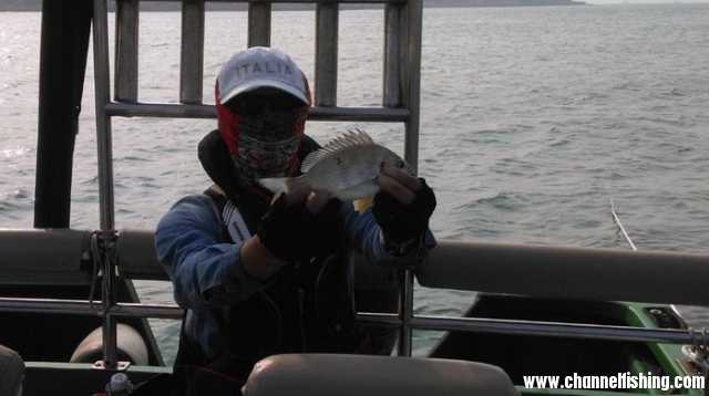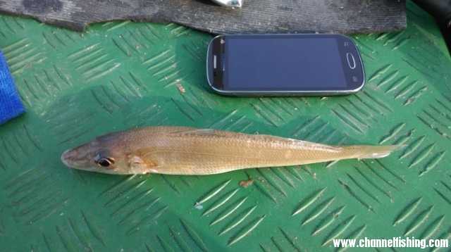 是不是有浪不会晕,有涌才会晕呢?还是单有浪或者有涌都不会晕,浪涌一起来才晕?浪是左右的,涌是上下的,上下左右全方位乱晃时,不晕才怪呢~考虑到晕船的问题,昨天的钓组我就没有拆了,今天开竿后马上就能测试水深的,探测一下,比昨天的钓点浅了约2米左右,挂上钓饵,开竿!水流比昨天急得多,立漂哗啦啦就依旧飘了出去,突然,浮漂不见了,挂底了!?还是水流太快,把浮漂都打晕了!?于是我赶紧收线提竿,中鱼!!!居然中鱼,呵呵,看来运气真的不错哦~~居然是一条肥美的沙尖啊!!!这么看来,在这一带完全可以玩一场滩钓沙尖的,如此肥美的沙尖实在是少见,老虎仔说,这是海中腊肠啊,可见,实在是喜人啊!!!我决定找机会专门来搞一次滩钓,呵呵~~