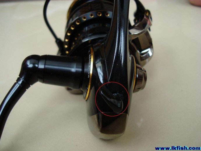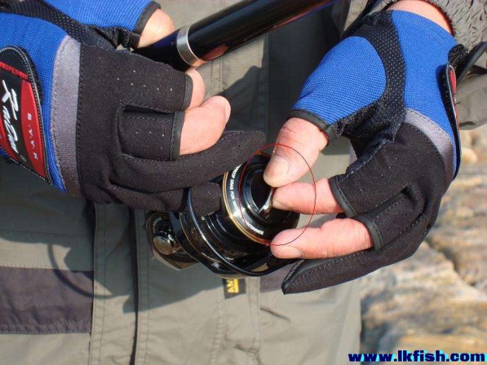 同自动卷线器相似,LB轮上也有一个禁止逆转的OFF开关,这一开关通过手刹杆进行控制,将手刹杆向最下面拨动就会进入这个档位,此时,线轮不能逆转。手刹轮在使用时建议不要使手刹杆位于OFF状态,以避免扬竿中大鱼时因来不及放松手刹而断线跑鱼。正确的扬竿方式应该是扣紧手刹扬竿,中鱼后随时根据拉力大小决定是否放松手刹以及控制施加于手刹杆的力量大小。(图九:手刹杆)