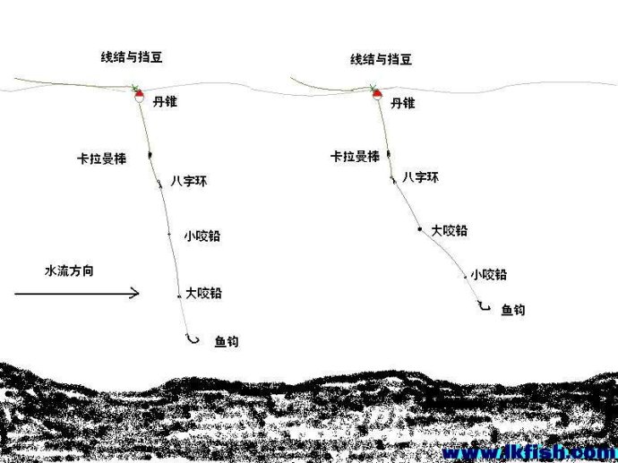 (图二十二:激流中使用水中同不使用水中的钓组对比)
