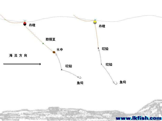 (2)能够捕捉真正的水流。海水由于大风和周围环境的影响,经常会出现表层水流的流速、流向同下层水流不一致的情况。遇到这种情况,如果线组中不加水中,浮标较大的体积在表层水流作用下就会按照表层水流的方向、速度行进,而我们撒的诱饵在穿过表层后会顺着下层水流走,诱饵同钓组不同向、不同速的问题会造成诱饵同钓饵分离,这样就会钓不到鱼。加挂水中后,水中能够利用自身体积接受所在的下层潮水力量,从而导引钓组按照正确的流向行进,使诱饵、钓饵与潮水同步。