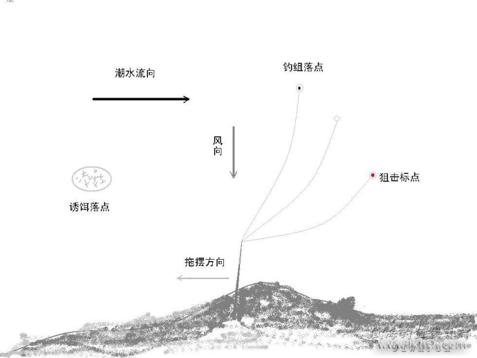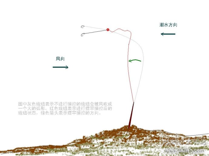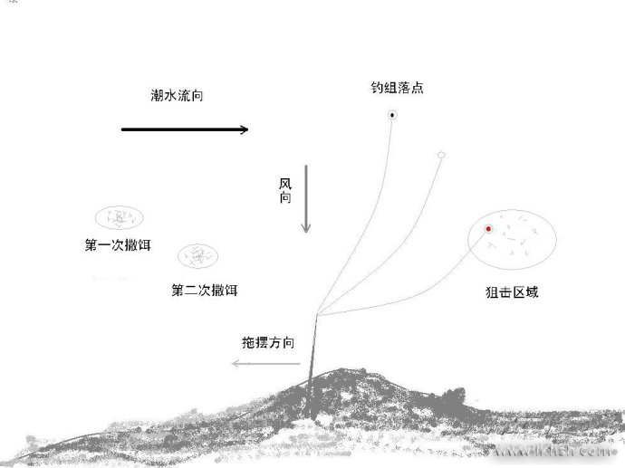 在横向流水中的钓组如果不受主线施加的外力作用,钓组将随着潮流的力量呈横向运动状态,同样道理,撒入潮流中的诱饵也会随着潮流的方向横向流动。可以看出,在这种情况下,我们要求的“诱钓同调”就比较容易实现。但是,一旦我们通过主线对钓组施加外力,钓组就不可避免的被拉向近岸方向,但我们却并不能操控撒进海里的诱饵,它们仍会沿着潮流的方向行进。在这种情况下,我们频繁操控钓组的结果就是使钓组很快偏离出诱饵带。