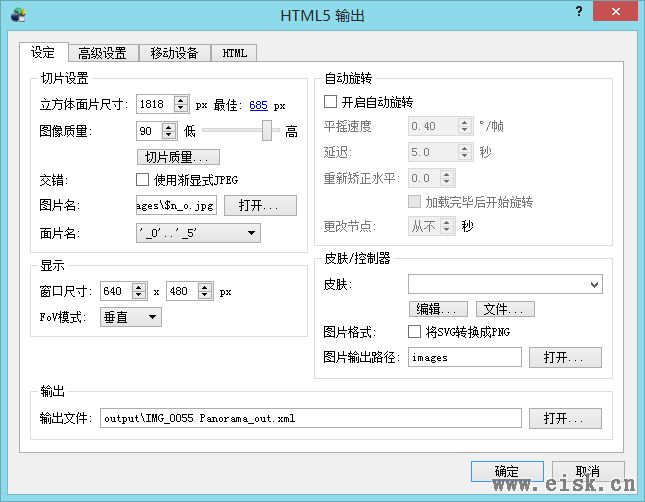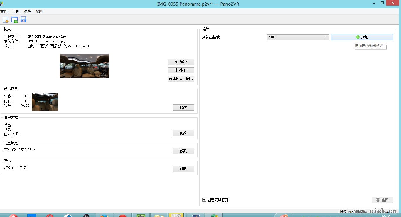在上图中,点击“选择输入”,将第二步生成的全景图片导入进去;同时点击“新输出格式”的下拉框,选择“HTML5”选项,然后点击“增加”按钮