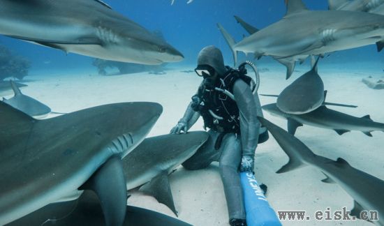 潜水员在鲨鱼的栖息被鲨鱼群环绕着,淡定自若。