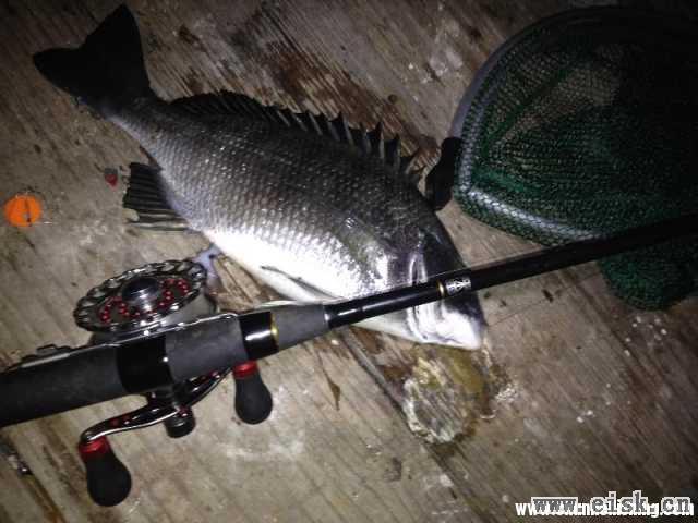 放竿再战没多长时间又中鱼,拉力很大,有了第一次中鱼的经验,放小了收线的幅度,以免鱼跑的距离太大,放线,收线,不一会儿一条大牛上水,赶快抄鱼入护,由于天黑又急于让鱼上水,收过了头。。。竿尾两个环废了。。。3.6斤牛屎上水筏竿面饵毕业。之后又上了三条一到二斤的黑沙,断了两口,十点收工,睡觉等到第二天再战。。。