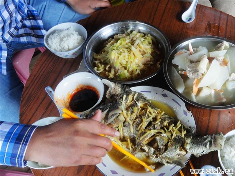 午餐:萝卜加小螃蟹滚汤,青菜炒土猪肉。小弟叫小李加了个菜,就是这条包公鱼。大冷的天,在茫茫大海上,能吃上热饭热菜,是件幸福的事。
