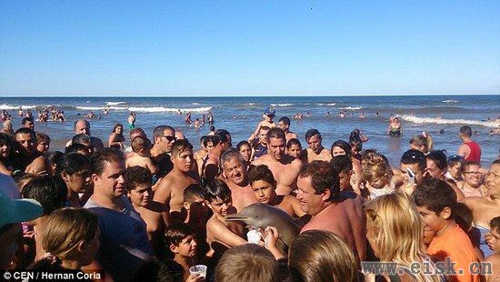 据说,当时在海边晒太阳的人发现这只可爱的小海豚后,就把它像战利品一样带上岸,一群人涌过来又是爱抚...又是合影留念的...
