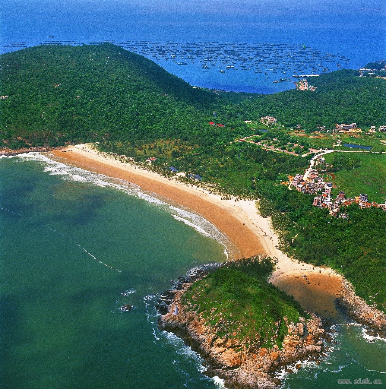 湾内海水冲击而成的沙滩滩长0.6公里,宽60——150米,沙质幼细洁净,沙滩坡度平缓,是绝佳的天然海滨浴场。