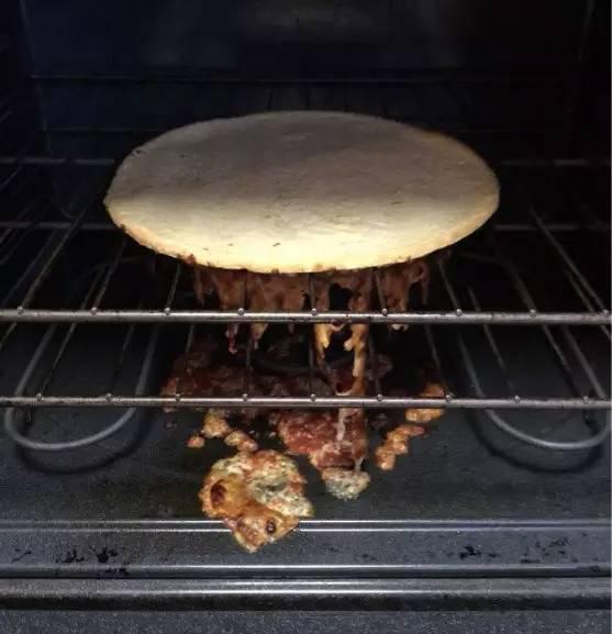 还有这位能把pizza倒过来放烤箱里烤的天才。。。