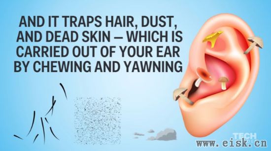 耳垢也能将掉进耳朵的毛发、灰尘和死皮困住,在你咀嚼或打哈欠时,这些东西会掉出耳朵。