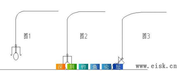 图1:将空钩放入水里,尽量靠近海底同时记住杆尖的这个弧度,用这个弧度钓鱼显然是不行的,这说明杆尖的弯曲弹力与钩的重量达到平衡,即使杆尖再平一点,当有浪或是排上有人走动时杆的上下振动会给钩造成附加弹力使得钩离开饵;