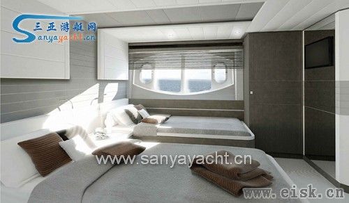 下层甲板区域同样聪明地由四间客舱组成,全部带有独立卫浴和海景大窗。还有大量为户外生活而设的空间:配备大日光垫的飞桥和主甲板船艏的一个外部休憩区。