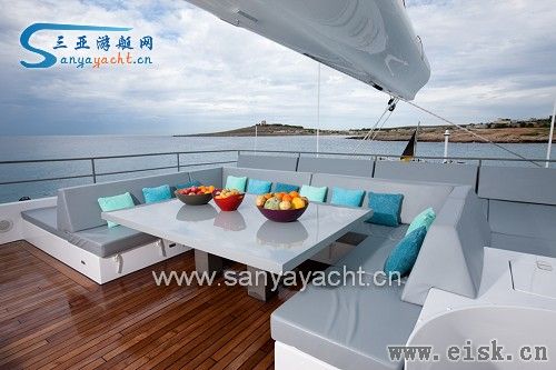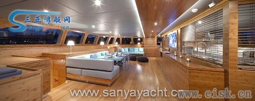 飞桥部分的主驾驶台配备全套自动导航系统和驾驶系统,表面达55平米,配有大日光浴垫、沙发、餐桌等。