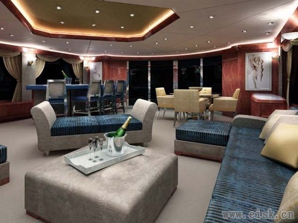 内部沙龙区十分开阔,四周有大面积舷窗,中央放置着风格不同的沙发,角落处设有吧台。整个区域以蓝色调和灰色调为主,淡黄色为辅,奢华典雅。