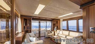 空间的划分展示出三个不同区域的创新。首先,宽敞客厅内的沙发面对面的摆放。走到船艏右舷,你会发现用餐区,里面摆放着一张核桃木餐桌和8张椅子。由于这块区域空间非常宽敞,让你有一种家的感觉,它会顷刻间让你忘记自己正置身于游艇上。然而,透过巨大的侧窗,你便能将美丽的外部景观尽收眼底。当游艇停泊时,你可以一边无拘无束地享受着美味晚餐,一边欣赏窗外迷人静谧的海景。