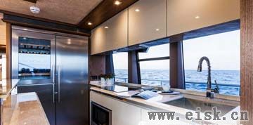 在船艏左舷,你会看到开放式的厨房,由镜面玻璃制成的,给人一种精致优雅的感觉,当门打开时,整个厨房便尽收眼底。实际上,那扇门是由6叶组成的,旨在创造一个舒适的大空间。当你在调制鸡尾酒或准备晚餐时,这里有足够的空间允许你与朋友及家人交流或分享,这也充分解释了为什么船艏厨房间摆放了一张沙发的原因。不管怎样,这块区域的材料品质和设备的功能性处处显示着高端。