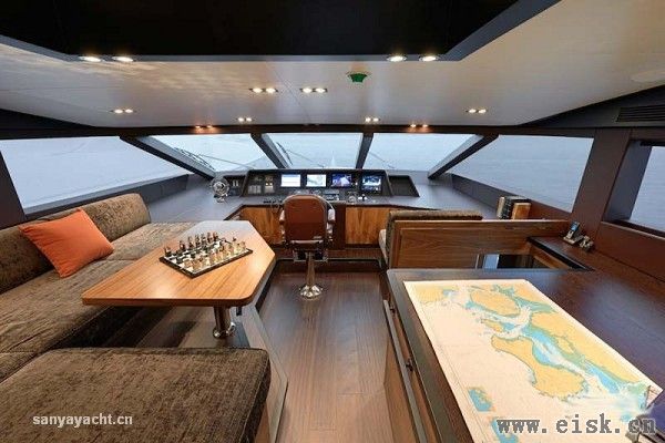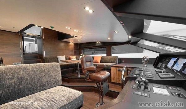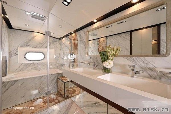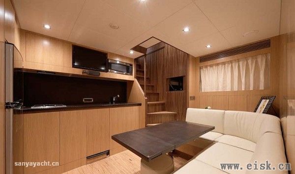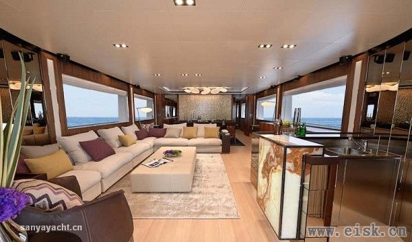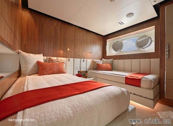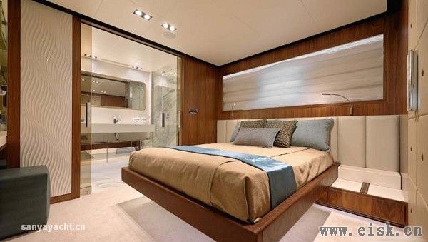 拥有更大空间和更好私密性的主人舱则远离宾客区,顶部安装有两个大圆天窗,与两侧长条大窗一起为内部空间提供了充足的采光。