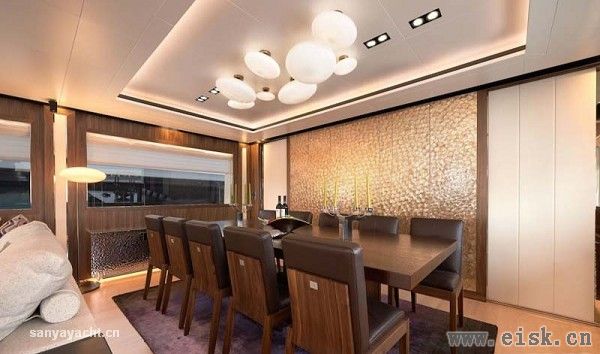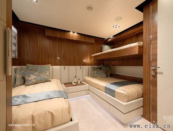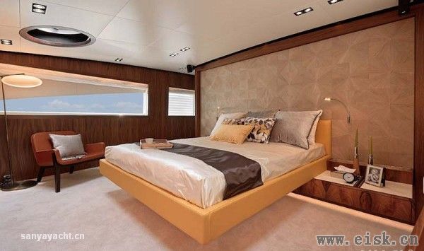 特别值得一提的是,所有套间中的大床全都看似悬浮,这一设计不仅有趣而创新,更为内部空间增加了一分现代感和时尚元素。这一构想也为游艇内饰设计带来新的灵感。