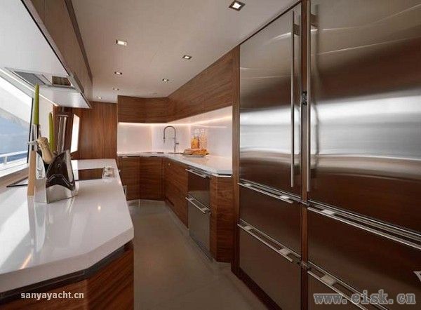 Carnival Liberty 3的主沙龙的宽敞区域内提供了充足的座椅能让所有宾客一起促膝长谈,超大舷窗设计不仅出于采光的考虑,还能让身处其中的人感受到宽敞的空间感。在艇上的厨房中,我们可以看到船东的个性化需求。厨房位于右舷,船员们出入十分便捷,这无疑大大提高了艇上聚餐派对的准备工作的效率。