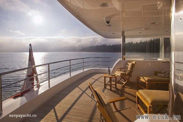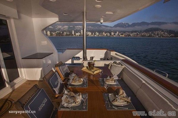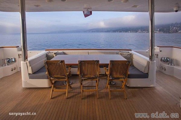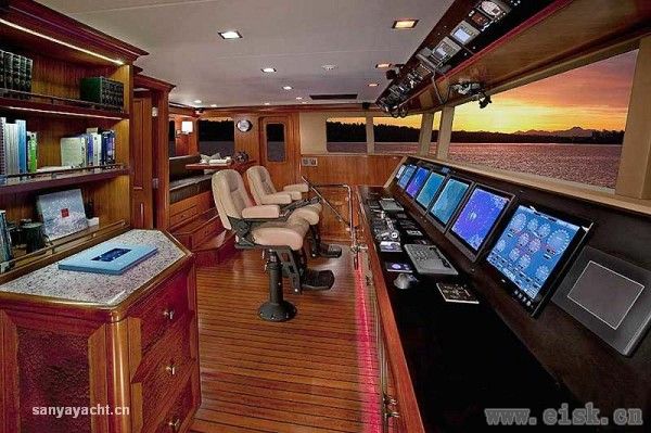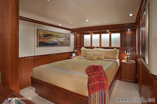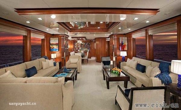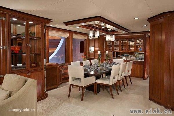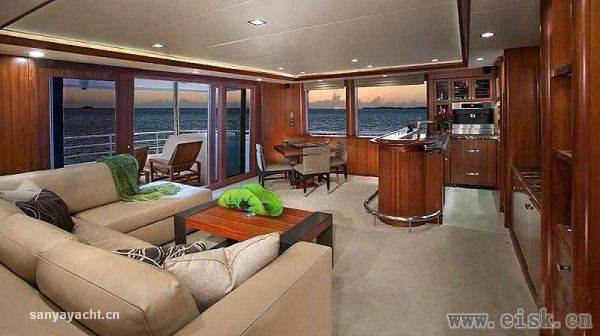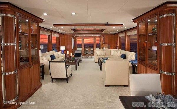 虽然甲板占据了大量空间,其内部仍然拥有非常大的储存量,内饰设计颇具个性,当然这一切得归功于Destry Darr工作室。优雅的古典风格中加入现代审美,精致的当代家具配以柔软的奶油色织物以及高档木材的自然色调,构成完美和谐的内部格调。