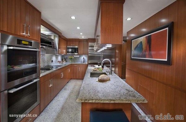 豪华的设计当然不止于此,即使在艇上的厨房,也能收获烹饪的乐趣和成就感。船东是一个非常懂得享受生活的人,厨房内设备齐全,布局也非常实用,让大厨们能在此发挥得得心应手。