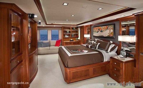 主人套间不仅宽敞明亮,且包含多个房间分别用作不同功能:与船等宽的卧室、休息室、办公室、私人会客厅、影视厅、男女独立浴室以及步入式衣帽间。