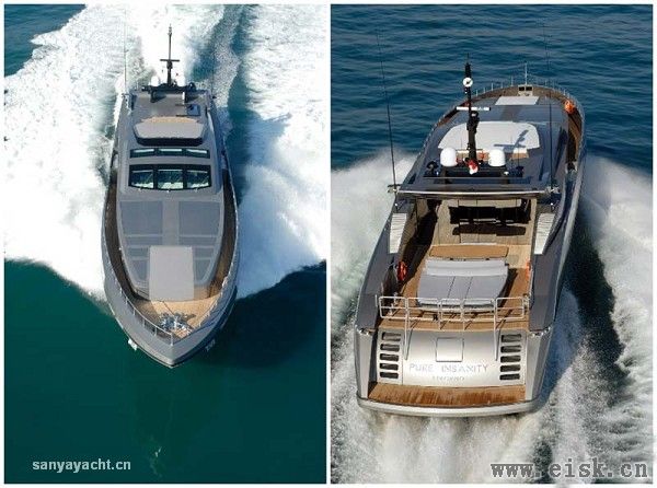Pure Insanity是一艘34米开放式硬顶动力艇,由位于瓦拉泽的Cantieri Navali Baglietto船厂建造。Francesco Paszkowski为她打造了超炫的深色金属灰船身,两台2,040 kW V12 MTU柴油机让她能够轻松达到30节,最快速度为33节。