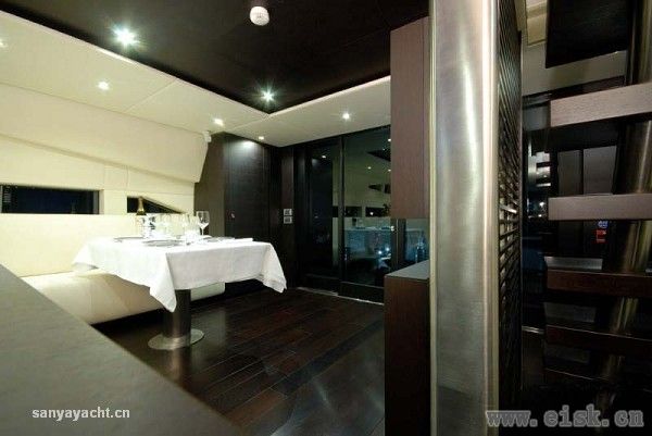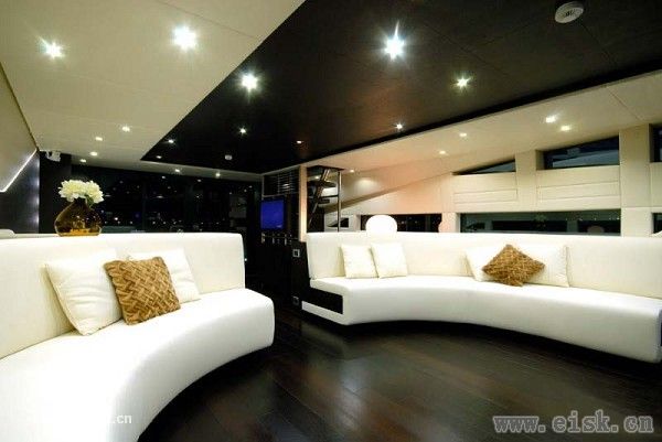 Pure Insanity的内在和她的外观一样充满未来感,地板、细木工家具以及墙板都选用了深色木料,与奶白色织物和天花板形成了鲜明对比,整个空间的层次在明暗之间错落有致。黑与白的色彩碰撞也事实上也是这艘游艇多用途设计理念的体现,船东希望这艘游艇能够用作日常出海同时也能符合租赁市场的相关标准。