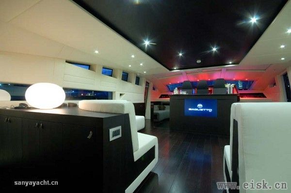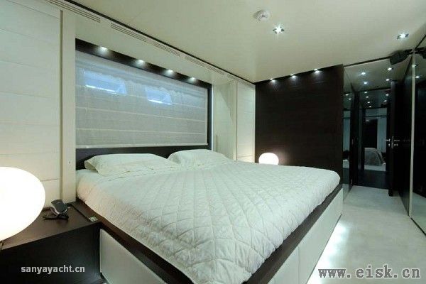 游艇内部包括一个主沙龙、一间餐厅和四间客舱。出于租赁用途的需要,对于艇上布局的灵活性设计师给予了特别的关注,因此甲板中央的主人舱虽然保持与船等宽,但仅比VIP客舱面积稍大一点,其余客舱可根据不同需求重新排布。这种种设计亮点都让她能成为一艘热门的租赁游艇,凭借在同尺寸游艇中骄人的速度,她能快速将宾客们送达目的地。
