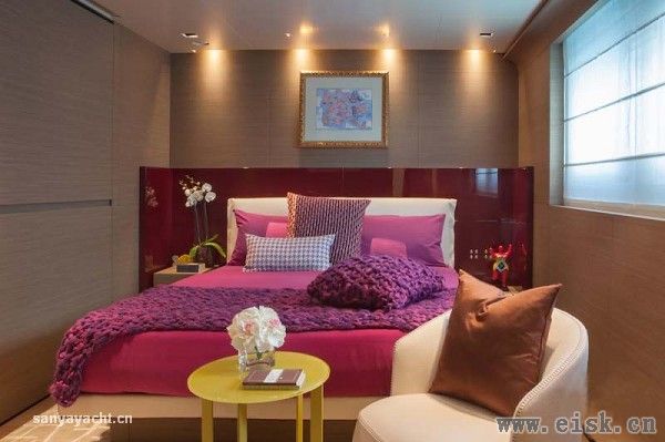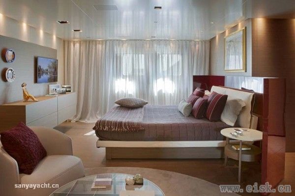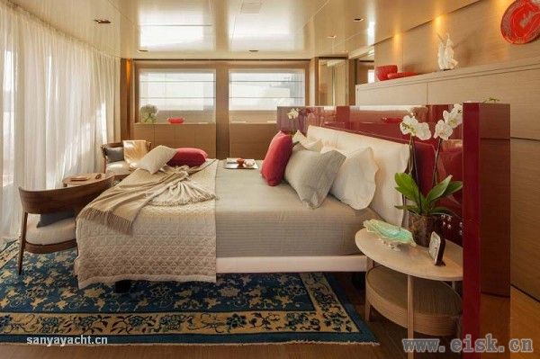 主人卧室位于船首,与大厅之间以C型玻璃门阻隔,一键式开合控制简单方便。事实上,这一设计的目的是能在宾客们在各层甲板自由活动,在享用健身房和日光浴甲板的同时又不会涉及到船东的隐私。
