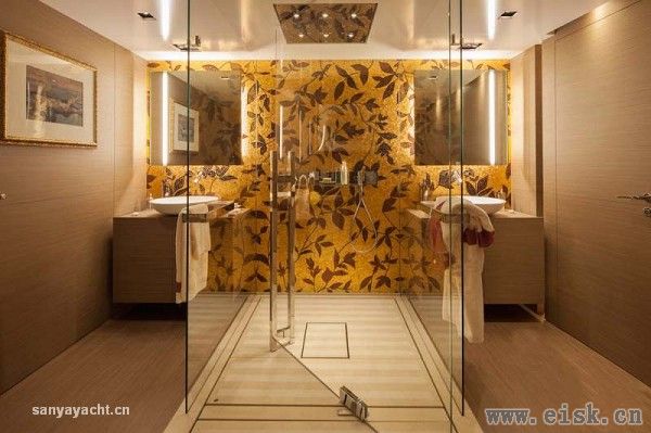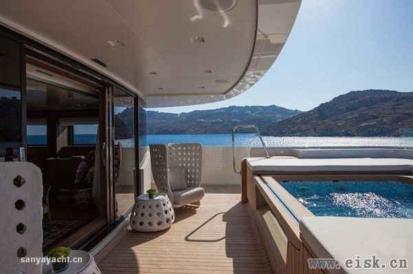 通过移门,主卧能够直接通到带有泳池的独立甲板区,泳池以浅蓝和白色马赛克拼接作为装饰,两侧还安放有日光浴垫。泳池前部边缘为玻璃材质,当夜晚灯光亮起,经过玻璃和水的折射,光影交织格外迷人。艇上还建有办公室和步入式衣帽间,构成了布局复杂却方便实用的船东甲板层。