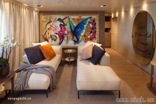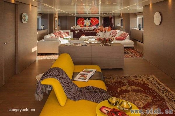 全长61.3米的Saramour宽度为10.2米,共有5层甲板。其内饰设计采用了极简主义风格,朴素的家具和精选配色为其主要组成。然而,低调并不等于没有格调,卡纳莱托核桃木、深紫红漆板以及Thala Beige天然石材的运用彰显了主人不张扬的个性品味。
