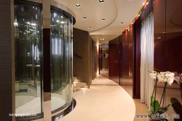 游艇中部圆形大厅中央安装有玻璃升降梯,周围环绕着螺旋型楼梯,连接各层甲板。自然光线由顶部射入,穿过悬空式台阶,营造了和谐而温馨的氛围。