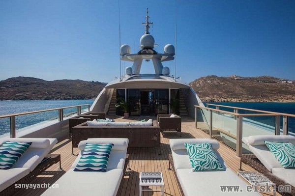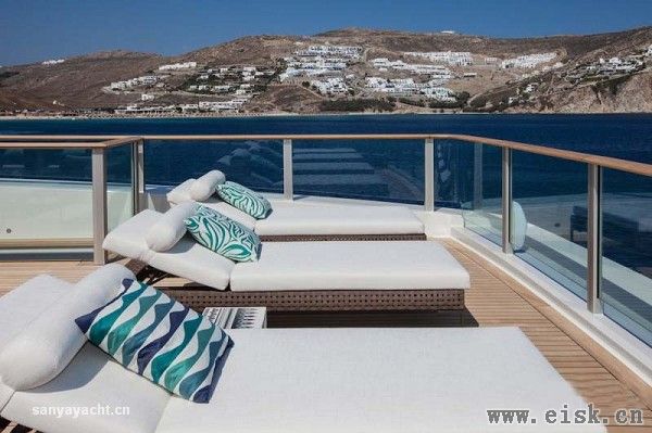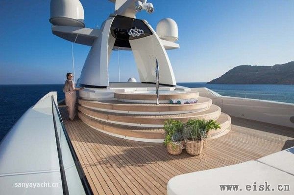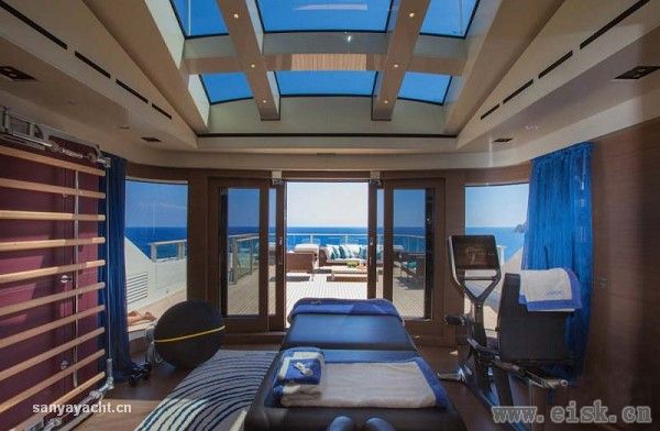 61米的长度让Saramour拥有面积傲人的飞桥甲板,这一层是专为热爱运动和保健的宾客们定制的。日光浴区位于最前部,舒适的躺椅小憩静坐两相宜,如果有需要,该区域经过简单变动还能化身停机坪。远离紫外线侵袭的室内健身房内,摆放着泰诺健健身设备,而按摩床也可移至户外。在出过一身汗后,土耳其浴室绝对能让宾客们彻底放松身心。