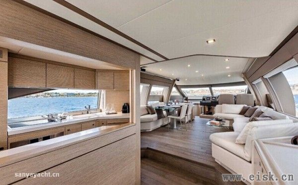 Ferretti Yachts 690长约21米,宽度超过5.5米,有两种不同的内部格局可供选择,即三个或者四个船舱。主甲板的特色是其空间经过了细致的划分。在下层甲板上,两种布局是基于通向下层甲板台阶的不同位置而设计的,并取决于走廊、客舱和舯部洗手间的不同设计。全船宽主卧舱依旧功能多样且空间宽敞。床后方干湿分离的卫浴以及宽敞的步入式衣柜增加了主卧舱和机舱之间的距离,能和船员舱、油箱一起将主卧舱和机舱隔开。全新的飞桥。