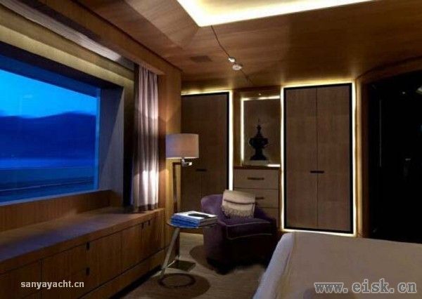 在主甲板的前面便是奢侈的全景主人房。里面分隔有书房,卧室和娱乐室。巨大的浴室中间摆放有浴缸,浴室还另外辟有淋浴间,并有男女分用的更衣室。