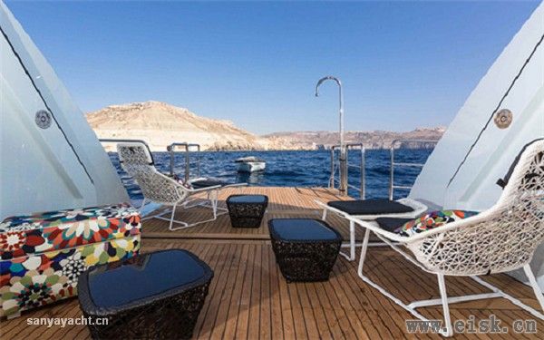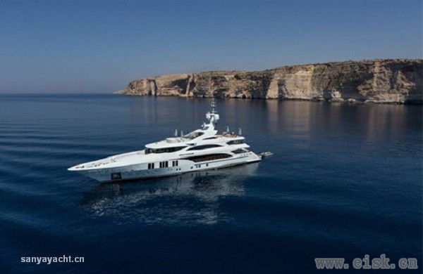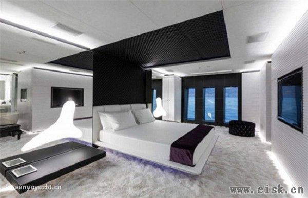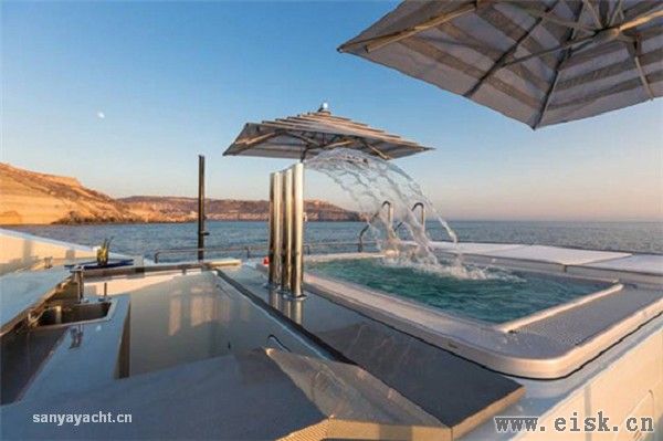 为了打造这片露天的天地,但又与补给艇和水上玩具的装卸区加以分隔,免去上上下下的恼人羁绊,贝尼蒂的设计师成功开发出一种侧门系统,配设一处系泊 平台,用于服务摩托艇和长6.2米的定制补给艇。在游艇航行途中,这艘补给艇存放于艇库中。救生艇单独存放于船首的救生艇艇库,一来隐藏在宾客的视线之 外,二来与大海分隔,起到保护作用。摩托艇安放在船首甲板的独立区域,船东和宾客若是途经此处,目睹存放于此的摩托艇,必然会心痒难耐,跃跃欲试。 船东本人对室内设计也颇有研究,此番也自然积极建言参与游艇的内饰设计,以期营造自然闲适的氛围。弥漫禅意的绿色植物盆景巧妙摆设于游艇各处,成功 赋予一份似乎触手可及的宁静。自然绿色的植物盆景摆放在透明平台上,而这些透明平台则兼作展示窗和舱内的自然采光窗口,从而令游艇具有了一份格外兼收并蓄 的包容格调。游艇诸多细节都由船东委托专门定制,比如衣柜门把手(由某设计大赛的冠军设计)、墙壁开关、灯具、自动舷窗和面板锁扣,以及彩色对比真皮线 缝。橱柜和多处“隐而不显”、与四周环境完美相融的储藏区还采用真皮包覆的内饰。 无论大小,不管显眼与否,所有空间的设计目的都由船东量身定制,从而确保与整个项目的设计灵感保持一致。上层甲板同样如此。日光甲板设有一个面积颇 大的游泳池,瀑布从一侧喷洒注入泳池;家具配装营造出自然的环境,便于在船上欣赏海景。健身房高居日光甲板之上,此外还配设一台小冰箱和DJ控制台。 船桥完整配备了贝尼蒂的“综合船桥”科技,可令船员迅捷轻松地操控船上的所有系统,从而保证了安全和必要时便利的维修操作。该系统采用触摸显示屏, 显示所有船上系统的运行状态,同时对报警和运行监控系统进行管理。船员从船桥即可完全掌控这艘游艇,如遇到任何故障,即使是游艇最偏僻的角落,也能立即得 知。这种先进的系统经贝尼蒂改进,同时还能监控空调系统,在不同天气条件下合理分配航行过程中空调的能耗。