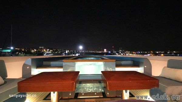 在Elada上,宾客们可以充分享用宽敞的露天区域。船首的高舷墙在前部的座位区和按摩浴缸周围形成了保护。艇上的另一处按摩浴缸则位于日光浴甲板前部,不得不提的是,两处浴缸不仅宽敞舒适,前部皆选用玻璃材质打造。