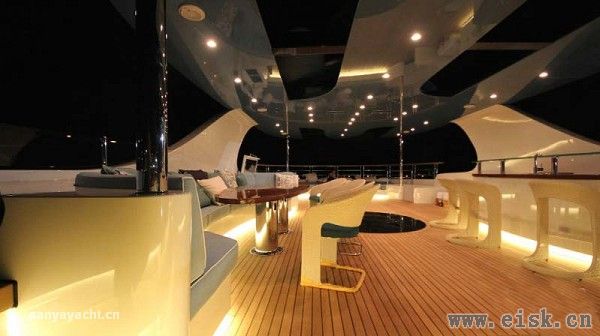 贯穿上层结构的蓝色喷漆点缀不仅契合了海洋的风格,更赋予Elada鲜明的个性和明快的基调。明亮的蓝色是由船东自己选择的,象征着这艘游艇和他本人的性格特质。通过后部移门可以到达异常宽大的海滨俱乐部,充足的空间同时还可用作日光浴区。船桥甲板和高空休息室连接部分放置了一张可容纳12人同时用餐的大餐桌。