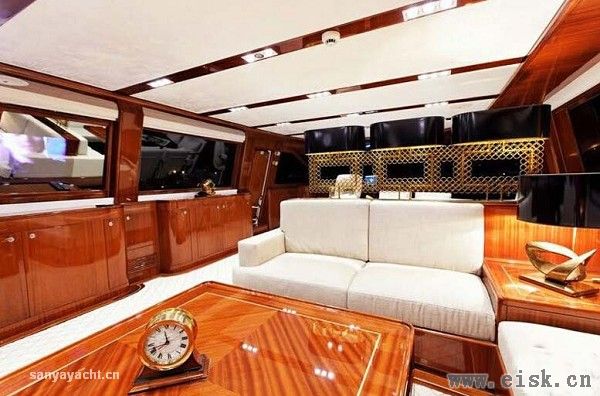 登上Glorious,瞬间它就向人展示出了它堪称广阔的空间,整艘船可以容纳8个人,开放式后甲板,带有遮阳棚的驾驶区,还有船上的露天用餐区,所有区域都没有拥挤的感觉。室内的空间感堪称完美,会客区和餐厅采用开放式平面布置,用U型沙发进行空间之间的结合,沙发配有边几,中间则放有一张四方形茶几。