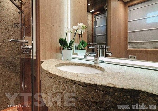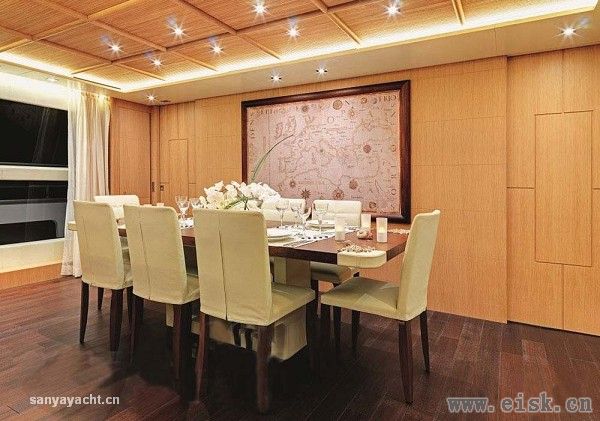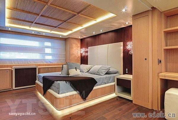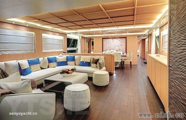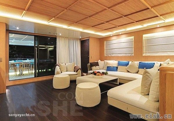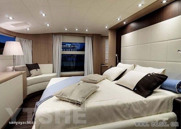 登艇后,让人感到温馨愉悦的时尚风格扑面而来。室内多采用暖调材料,如橡木、柚木、竹子和皮革,加上大量精美的细木工制品,营造了舒适柔和的情调。进入主沙龙区,投射在墙板和橱柜上的柔和光线奠定了整体基调,自然和谐的氛围仿佛在迎接您来到这个采光和通风良好的现代风格空间。天花板以及网状表面赋予房间些微异域魅力,深色地板与整个空间形成的柔和色差增添了暖意。