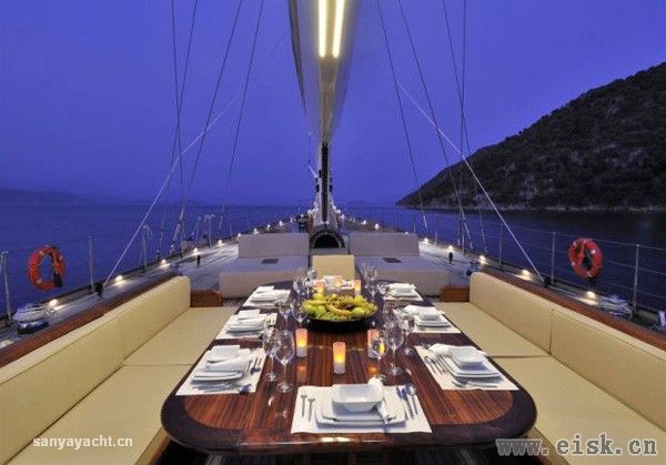 这艘超级游艇甲板长度49.7米,为户外娱乐、休憩提供了宽敞的空间。船头船尾的甲板上各放置了一张12人的大餐桌,可一边吹着海风,一边用餐。