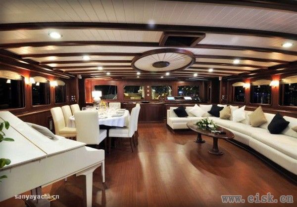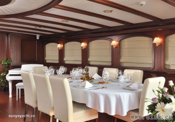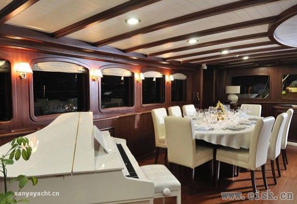 走进船舱,里面是桃花心木和��色家具的经典搭配。舱内的交谊厅非常大,里面有电视、圆形大餐桌和一架白色的小型三角钢琴。