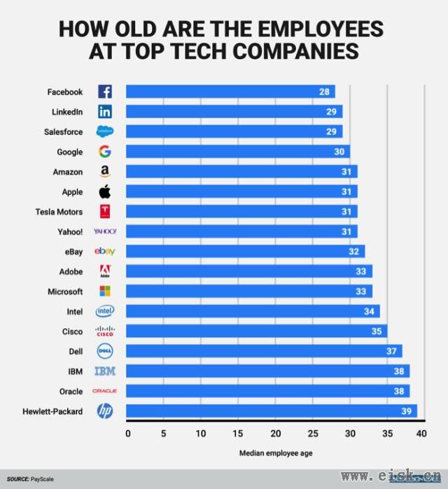 据美国知名调查机构 Payscale 调查显示,一些高科技公司的年龄中位数是30岁以下。那些更成熟一些的技术公司如戴尔、IBM、甲骨文,才有年龄更大一些的劳动力,年龄中位数超过了35岁。