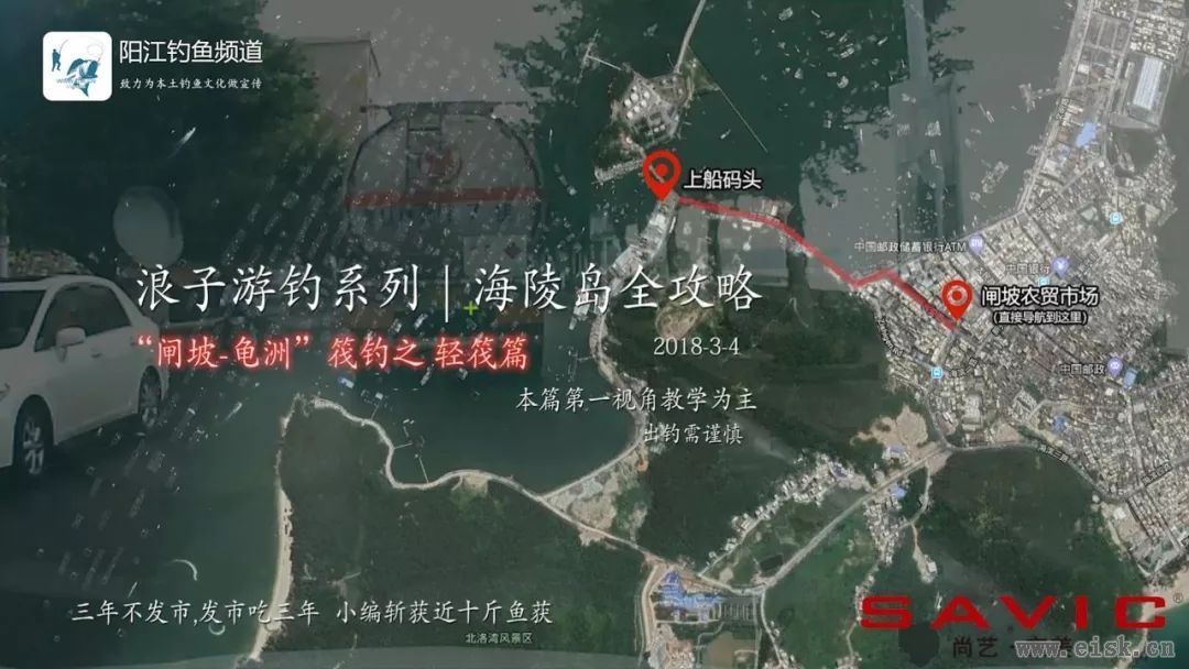 外地来的朋友直接导航到“闸坡农贸市场”,然后沿着红色路线往码头方向去。沿途有渔具店可以补充下装备,也可以在农贸市场购买虾一类鱼饵。