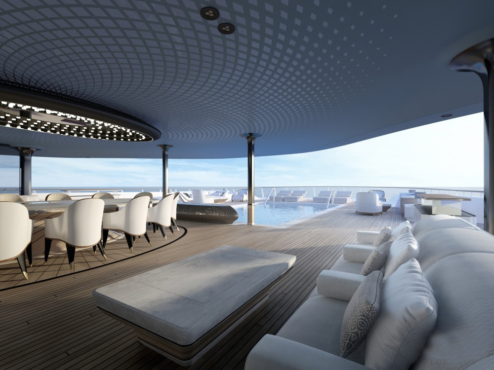 而Jubilee的形成背后还有巨大的推动力,Lobanov原来是一名汽车设计师,他擅长从各个领域的设计理念中寻找灵感,而这艘游艇也是如此。“是现代建筑,”Lobanov说,“在Jubilee之前,我们已经有一款名为Unfoundland的概念,它的甲板高度超出寻常游艇。”工作室借鉴了建筑设计方案实现完美比例和优雅外观,同时赋予其超大内部容量。“于是我开始思考如何采用一种具有迷惑性的造型来弱化游艇的真实高度。我们为她设计的外观看上去比她的实际层数更多,我认为这艘110米游艇在外观上像140米。” Unfoundland的原始平台也不再使用,但保留了造型和设计成为我们现在看到的Jubilee。