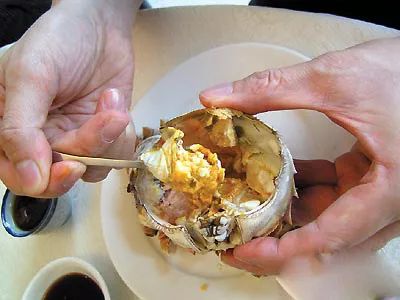 先吃蟹盖部分,用小勺把中间的蟹胃部分舀出,轻轻将外面包裹着的蟹黄吮干净。注意,不要吮破中间那个呈三角锥形的蟹胃,应将其丢弃