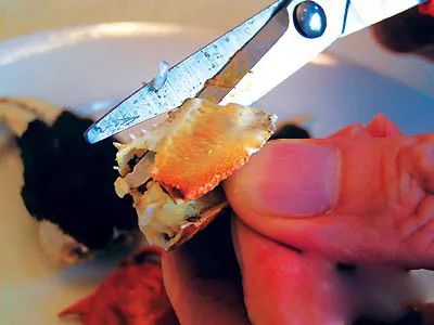 吃完蟹盖轮到蟹身,先用剪刀将多余的蟹脚、蟹嘴和蟹肺剪掉;