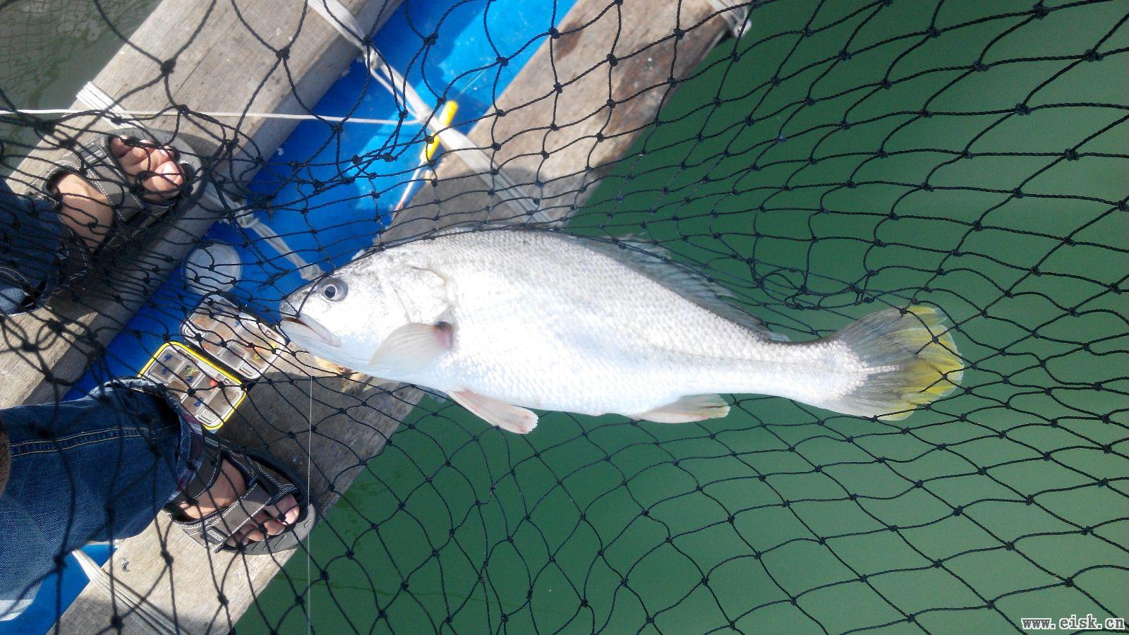 突然表弟说中鱼啦,很重......不到三分钟一尾1.5斤重的白花鱼。这时候我的竿有动静了.....没空理会,估计是条小鱼吧。把白花放好后就慢慢走过去起杆,有点沉,莫非?果然!一条刚好一斤重的黄脚上来了。
